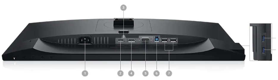 1. Power Connector | 2. HDMI Port | 3. Stand Lock Feature| 4. DisplayPort | 5. VGA Connector | 6. USB Upstream Port | 7. USB Downstream Ports | 8. USB Downstream Ports