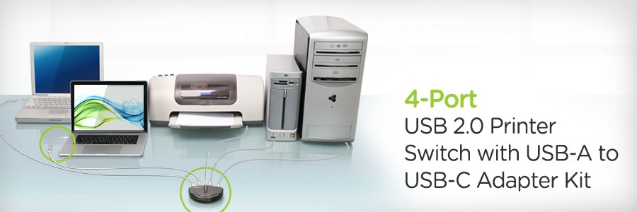IOGEAR's 4-Port USB 2.0 Printer Switch Kit allows up to four (4) USB-A or (3) USB-A and (1) USB-C PCs or Macs to share one printer. No more plugging and unplugging between computers or fussing with wireless printer connections.