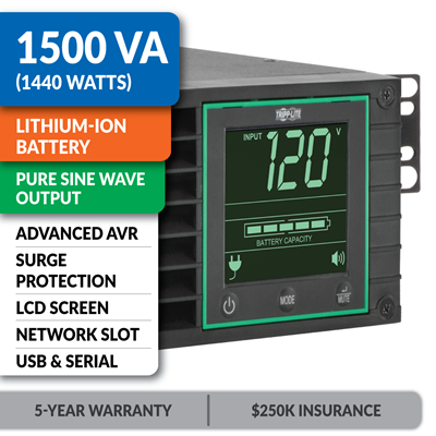 This UPS system also has a lithium-ion battery and a high power factor. The lithium-ion battery has a longer service life and recharges faster than a comparable lead-acid battery. The high power factor allows you to connect more equipment to each UPS and circuit.