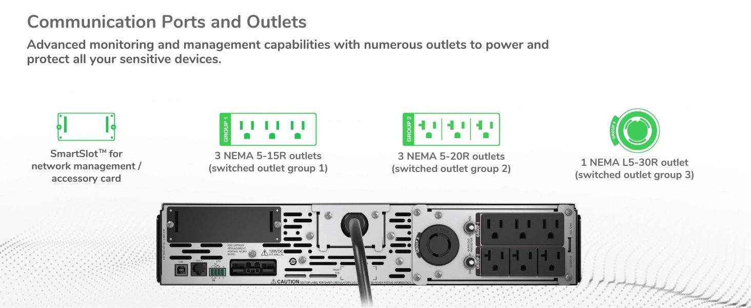 3 switched outlet groups Control a group of output load receptacles independent from the main UPS. |