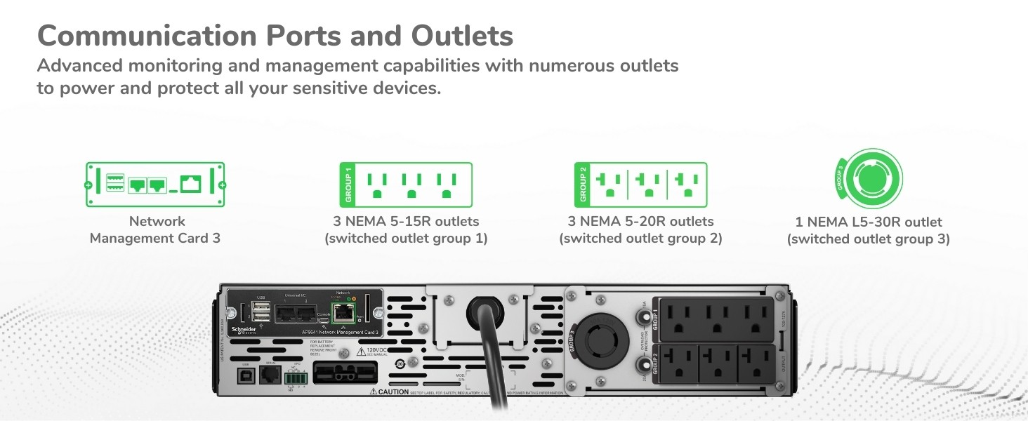 Pre-installed network management card Enables network-based monitoring and management of UPS. |