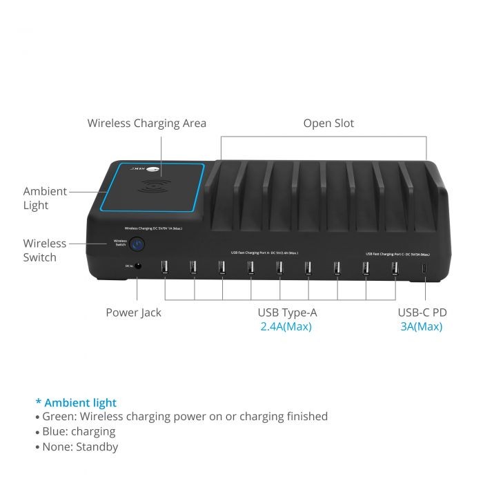 10-Port USB-A/C & Wireless Charging Station with Ambient Light Deck