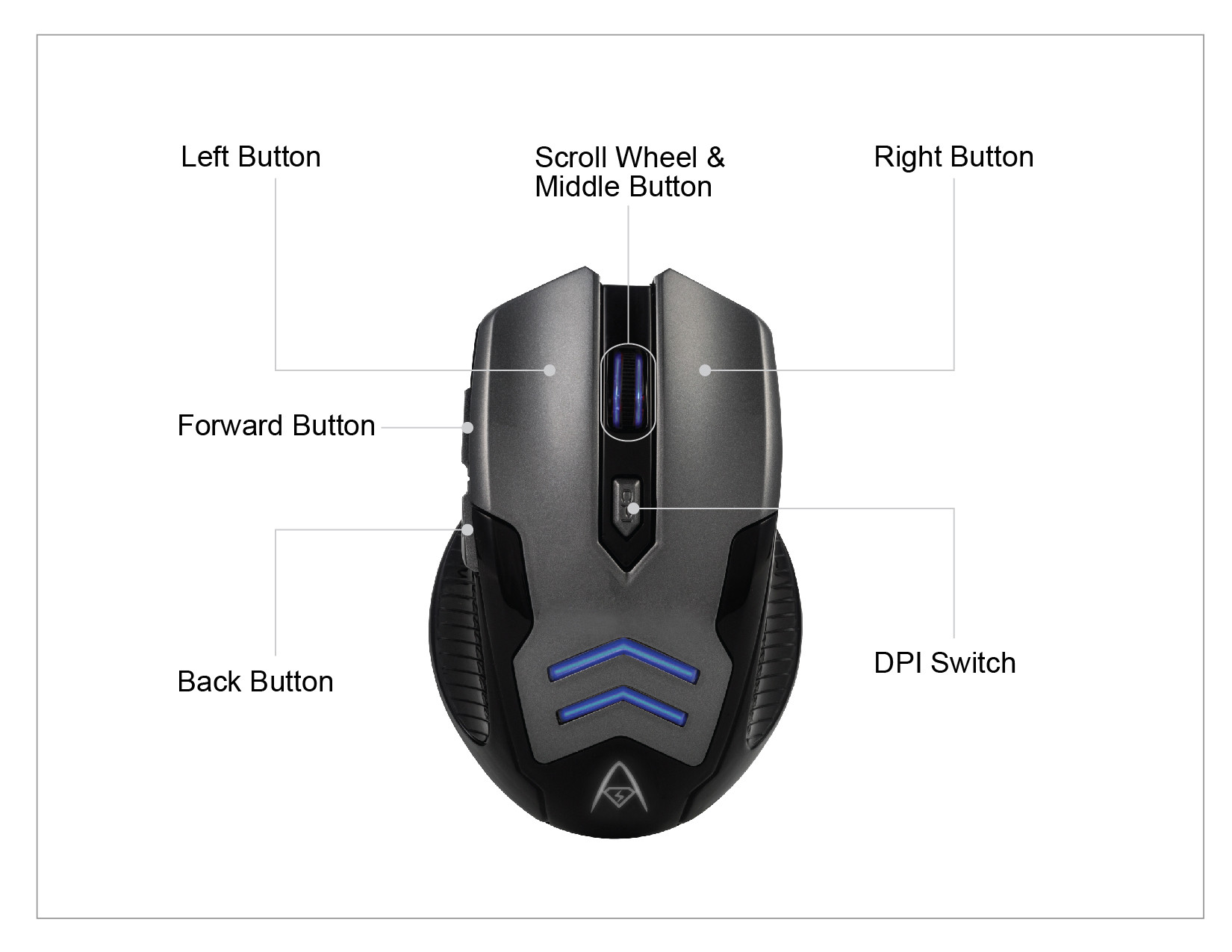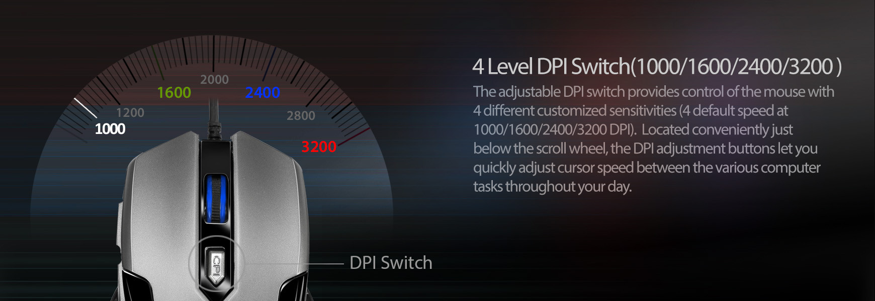 The adjustable DPI switch provides control of the mouse with 4 different customized sensitivities (4 default speed at 1000/1600/2400/3200 DPI). Located conveniently just