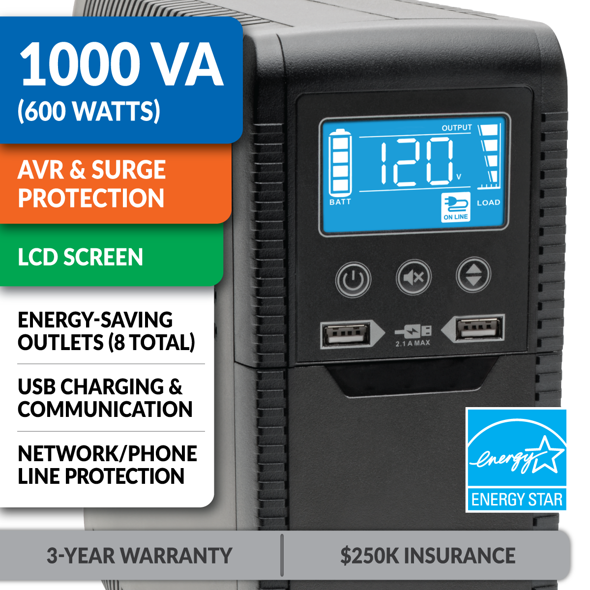 The LCD shows helpful data, including input/output voltage, battery charge level, estimated battery backup runtime remaining, input/output frequency, power status, UPS mode, AVR operation, load level, load VA, load wattage and fault conditions. You can also use the LCD to access a variety of UPS settings, including energy-saving (ECO) mode enable/disable.