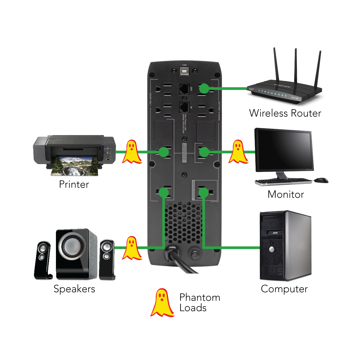 Every AC adapter and glowing LED represents a potential “phantom load,” which is electricity wasted by an idle device, even when it appears to be turned off. This UPS system helps eliminate phantom loads.