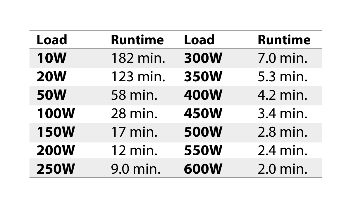 • Half-Load Runtime: This UPS system will support a 50% load (300 W) for up to 7 minutes.