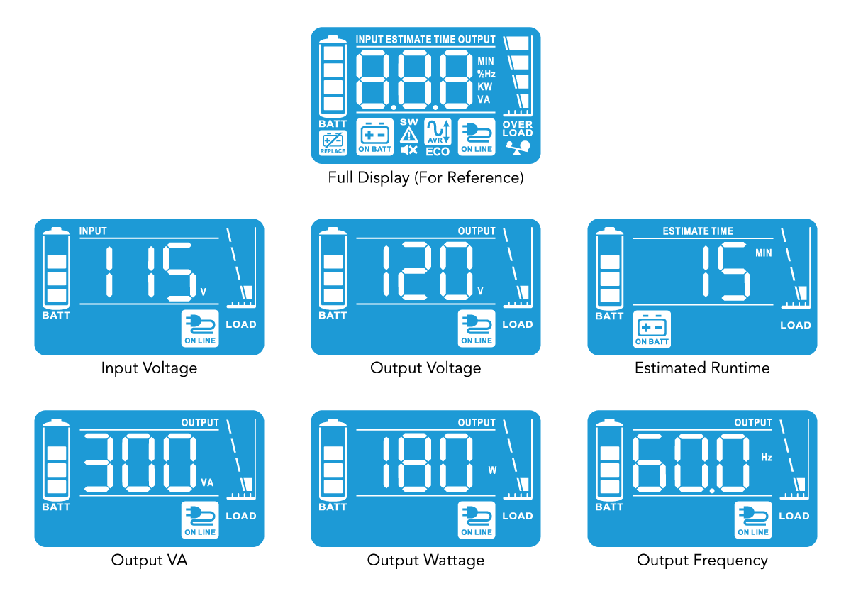 The LCD shows helpful data, including input/output voltage, battery charge level, estimated battery backup runtime remaining, input/output frequency, power status, UPS mode, AVR operation, load level, load VA, load wattage and fault conditions. You can also use the LCD to access a variety of UPS settings, including energy-saving (ECO) mode enable/disable.