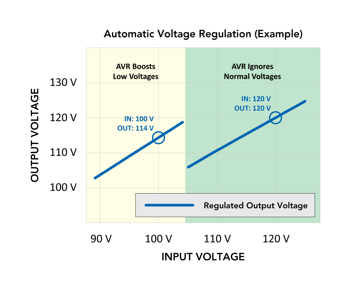 In locations with chronic voltage problems, frequent switching to battery drains reserve power and shortens battery life. This UPS system has a feature called automatic voltage regulation (AVR) that solves the problem. It detects when input voltage is out of bounds and corrects the voltage without using the battery.