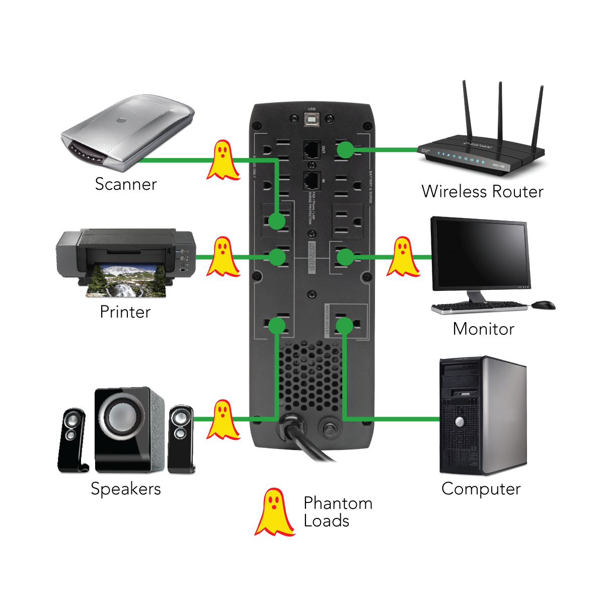 Every AC adapter and glowing LED represents a potential “phantom load,” which is electricity wasted by an idle device, even when it appears to be turned off. This UPS system helps eliminate phantom loads.