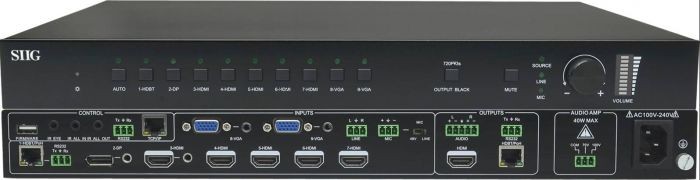 Allows you to select and switch between any of the 9 source devices (1 DisplayPort, 5 HDMI, 2 VGA, 1 HDBaseT) to display on a HDMI display through single economical CAT5e/6 cable up to 70 meters (70m-1080p/40m-4K) using advance HDBaseT technology with audio and IR control