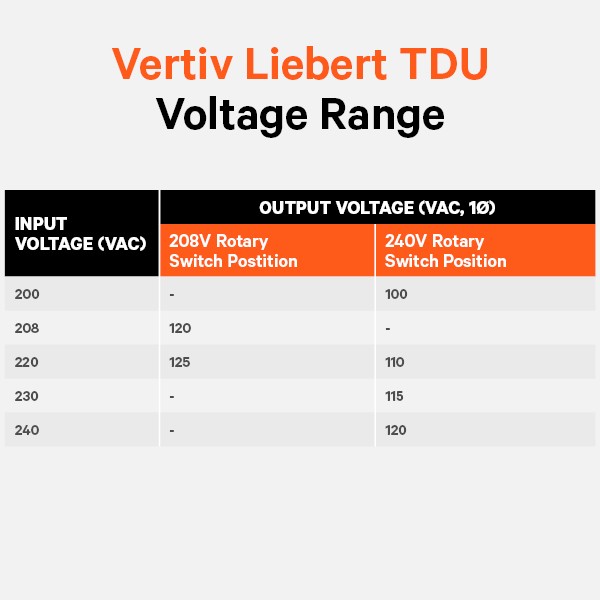 When 5kVA and higher single phase UPS products only accept 208VAC input power, users consider step down transformers such as Vertiv Liebert TDU, which accepts 208 or 240VAC (200/220/230 VAC acceptable) input and converts it to 120VAC (L-N) output.