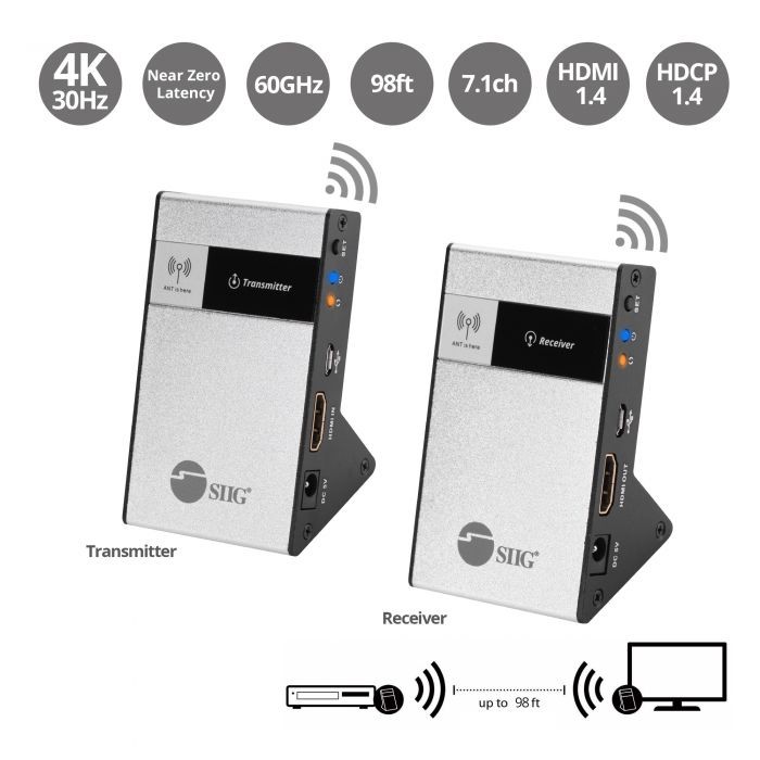 - Wirelessly transmits uncompressed 4K HDMI signals with stereo audio up to 98ft (line of sight)