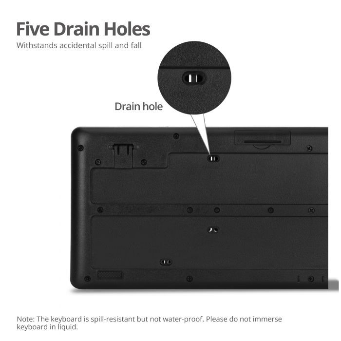Spill resistant keyboard with 5 drain holes withstands water spills