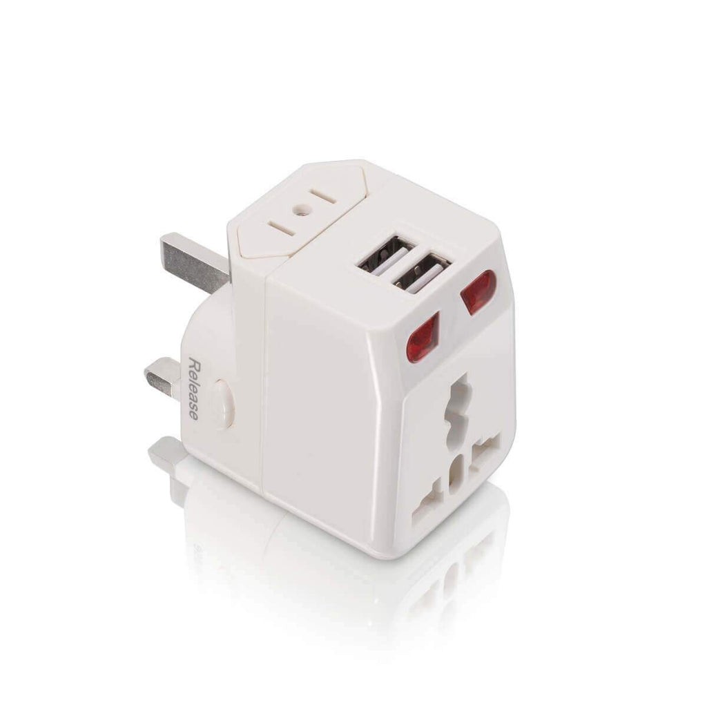 iStore's World Travel Adapter cube includes 2 USB-A ports and is rated for voltages ranging from 110 VAC to 250 VAC and a max current rating of 10 Amps. Compatible with standard AC wall outlets in over 145 countries around the world.