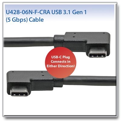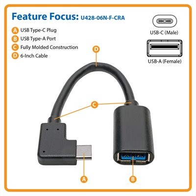 By powering and connecting different USB devices, Tripp Lite’s U428-06N-F-CRA USB Type-C™ (USB-C™) to USB-A, 3.1, Gen 1 cable helps you manage your computers and peripherals efficiently. This black, 6 in. cable with a right-angle USB-C/Thunderbolt™ 3 (M) connector and a USB-A (F) connector supports data transfer rates up to 5 Gbps and provides power output up to 3 amps (60 watts), more than sufficient for charging, syncing and powering compatible devices.