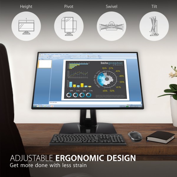 With advanced ergonomic features, ViewSonic monitors are designed to provide a greater range of adjustment for increased productivity and comfort. Users can reduce eyestrain and physical fatigue by adjusting the monitor via swivel, pivot, tilt, and height adjust options.