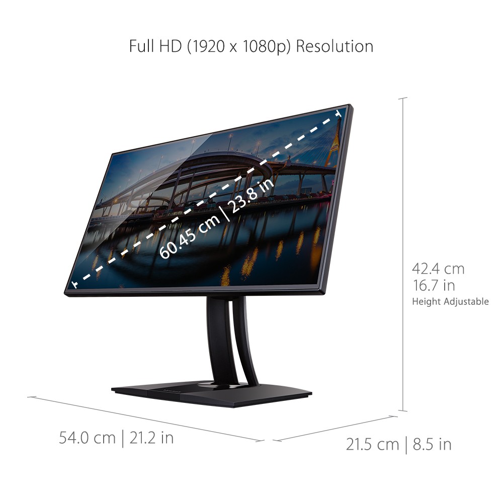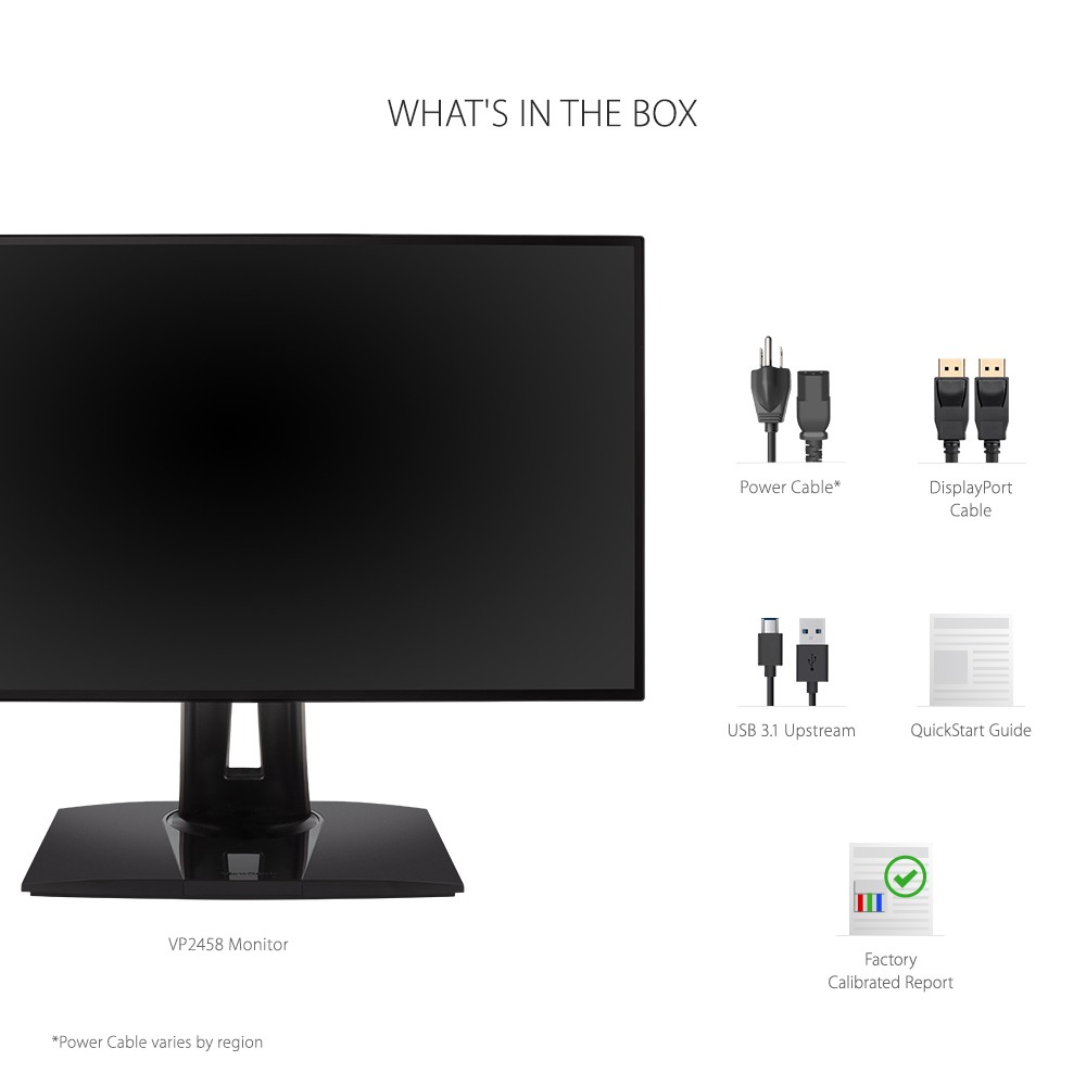 VP2458 is a professional-grade 24” (23.8” viewable) Full HD monitor designed for enterprise professionals. 100% sRGB color coverage and Delta E ® IPS panel technology offers wide-angle viewing and incredibly vivid colors, and a 4-sided frameless design provides a seamless viewing experience for multi-monitor setups. What’s more, with advanced ergonomic tilt, swivel, pivot, and height adjust features, this monitor provides a comfortable viewing experience and vivid images no matter your vantage point. Extensive connectivity options include VGA, HDMI, and DisplayPort so that you can connect to a variety of HD and analog devices – today and tomorrow. In addition, Flicker-Free technology and a Blue Light Filter help to minimize eyestrain from extended viewing periods.