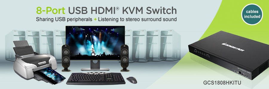 IOGEAR's 8-port USB HDMI KVMP Switch with USB Cable Sets allows you to control and access up to 8 computers from a single USB keyboard, USB mouse, and an HDMI monitor console. With the included USB KVM Cable Sets, experience high definition video resolution to 1080p (1920 x 1200) while sharing USB 2.0 peripherals and listening to 2.1 stereo surround sound.