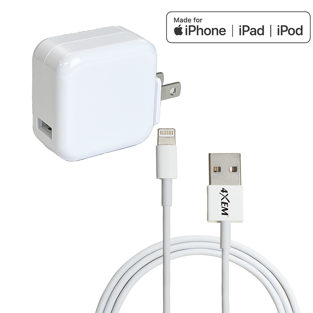 4XEM's iPad Charger and Cable Combo Kit features a compact USB Wall Charger/Power Adapter plus a durable 6 foot MFi 8-pin Lightning charge and data transfer cable.
