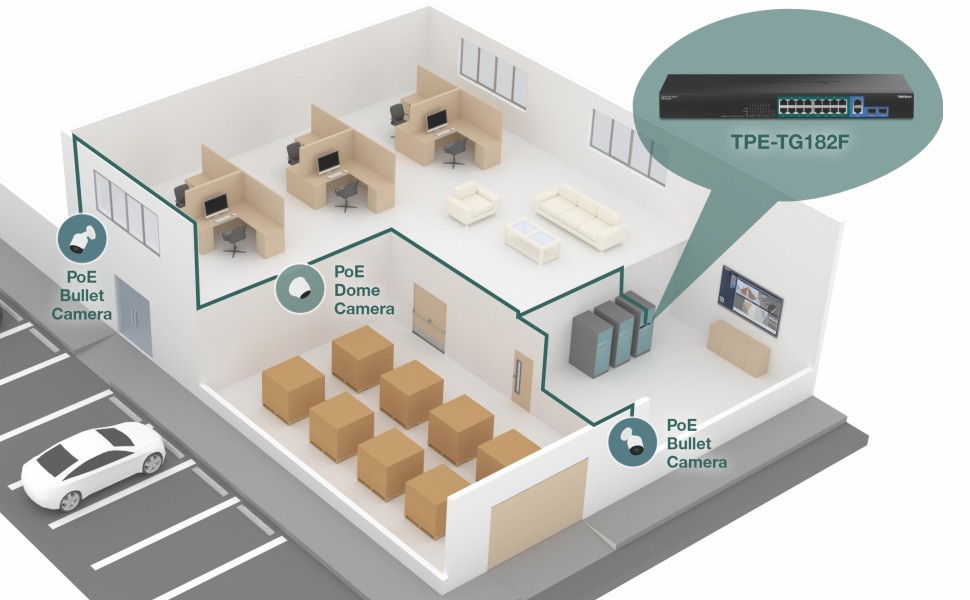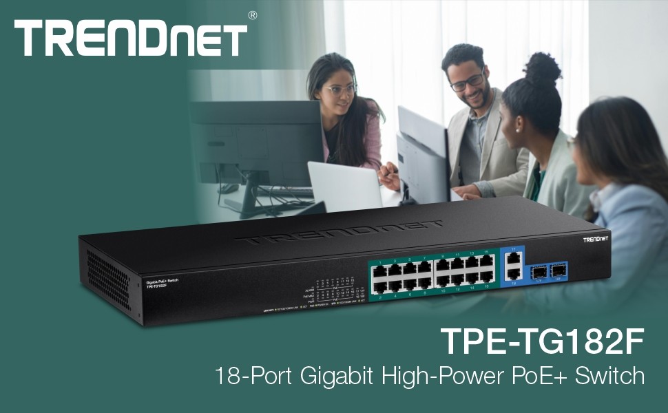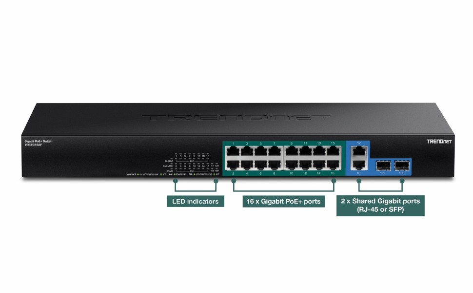 TRENDnet’s 18-Port Gigabit High-Power PoE+ Switch, model TPE-TG182F, reduces equipment and installation costs by delivering data and power over existing Ethernet cables. This rack mountable, high-power PoE switch provides 16 gigabit PoE+ ports with a total PoE power budget of 440W. It also features two additional shared RJ-45 or SFP gigabit ports. The TPE-TG182F high-power PoE+ switch supplies up to 30W of power per port for devices such as high-power wireless access points, PTZ (Pan/Tilt/Zoom) IP cameras, and other PoE+ systems.