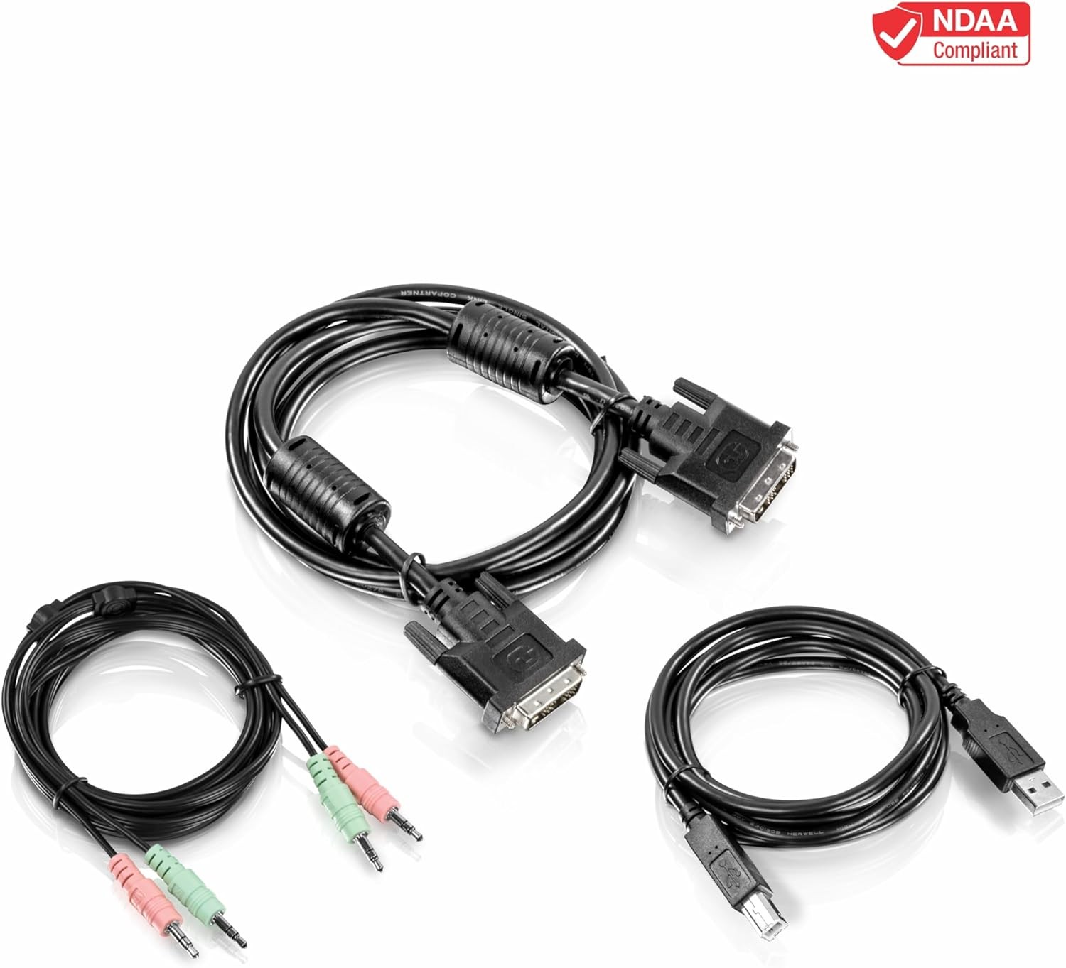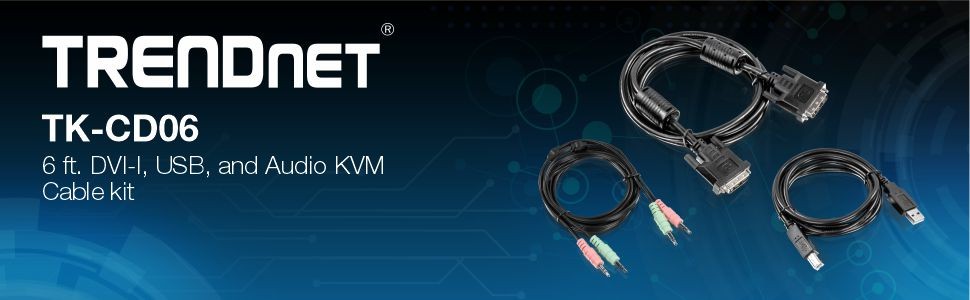TRENDnet’s 6 ft. DVI-I, USB, and Audio KVM Cable Kit, model TK-CD06, is designed to connect a DVI computer to the TRENDnet TK-232 KVM switch. The cable kit consists of a USB mouse/keyboard, DVI-I, and 3.5mm audio connections for a single computer.