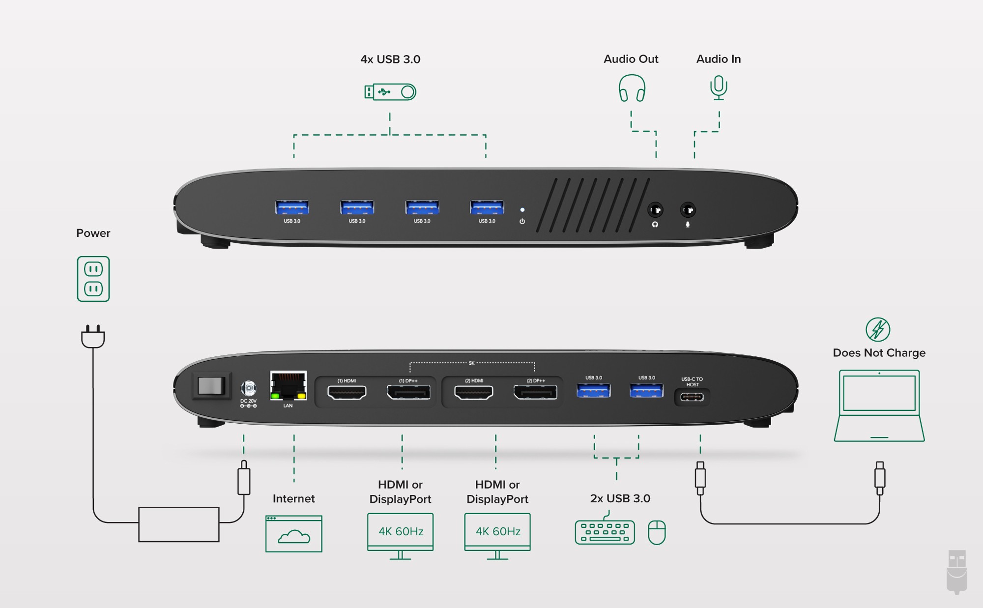 Note: The UD-6950H will not charge your laptop and will need your external charger to provide power to your system. Due to limited USB 3.0 bandwidth and reduced hardware graphics acceleration of the DisplayLink software and hardware used in this docking station we do not recommend it for use with full screen video playback, 2D or 3D graphics applications, or video editing software.