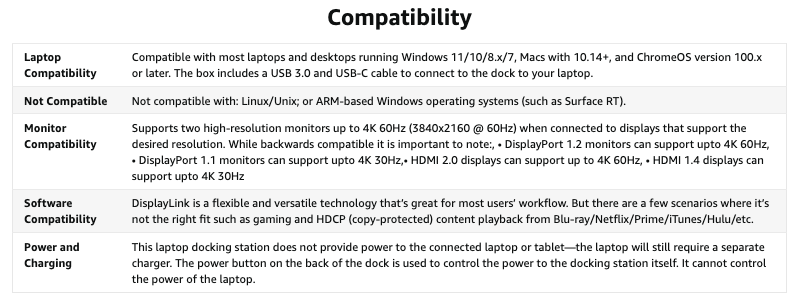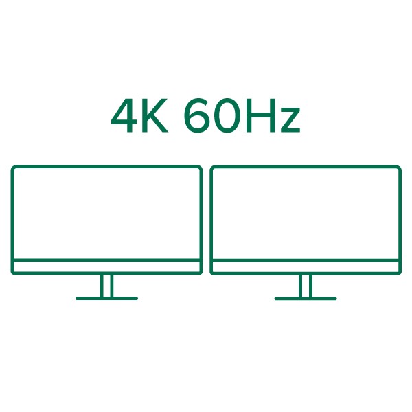 High-Resolution DisplaysGet more screen space for more productivity. High resolution displays (both DisplayPort, not HDMI) will change the way you manage your out of control tabs and your workflow. No more grainy visuals and tiny screens. Expand your screen real estate with this dock and cut down the time it takes to work on those highly productive tasks. Note: To achieve 4K 60Hz each connected monitor and cable must support the desired resolution and refresh rate. |
