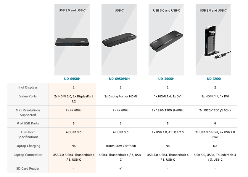 Designed for those who want a one-stop upgrade for your USB 3.0 or USB-C laptop. The Plugable Dual 4K USB Docking Station (UD-6950H) allows you to add dual displays, using DisplayPort or HDMI, and connect your peripherals, all through a single cable back to your laptop. Quickly come and go from your desk with ease. By connecting many devices with just one cable to your laptop, you gain 12 extra ports of connectivity, making it easier to do more work in less time.