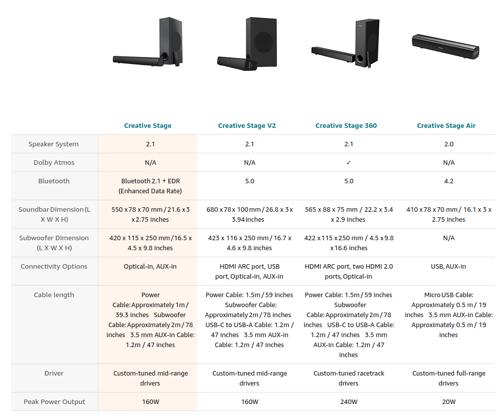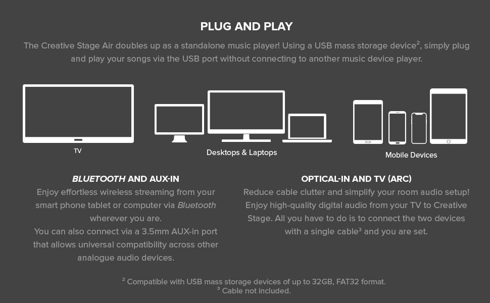 We've set the stage for complete audio entertainment for your room. Creative Stage has a high-performance under-monitor sound bar for your computer and TV. The accompanying subwoofer provides the perfect enhancement for rich, punchy bass that reverberates throughout the room. With a host of connectivity options, this is the perfect audio entertainment system to use whether on a desktop or in the living room. Enjoy room-filling, immersive sound with incredible bass on the creative stage.