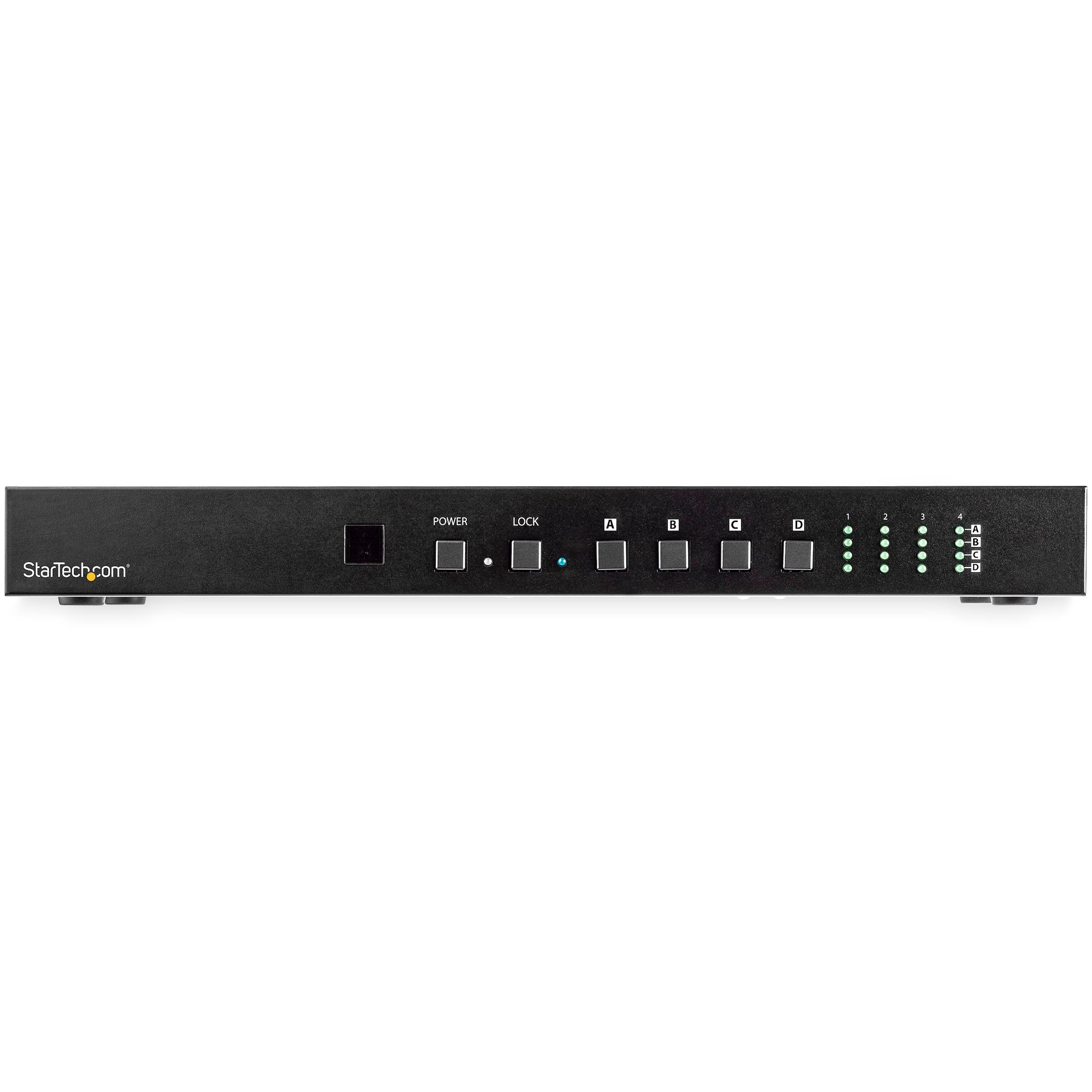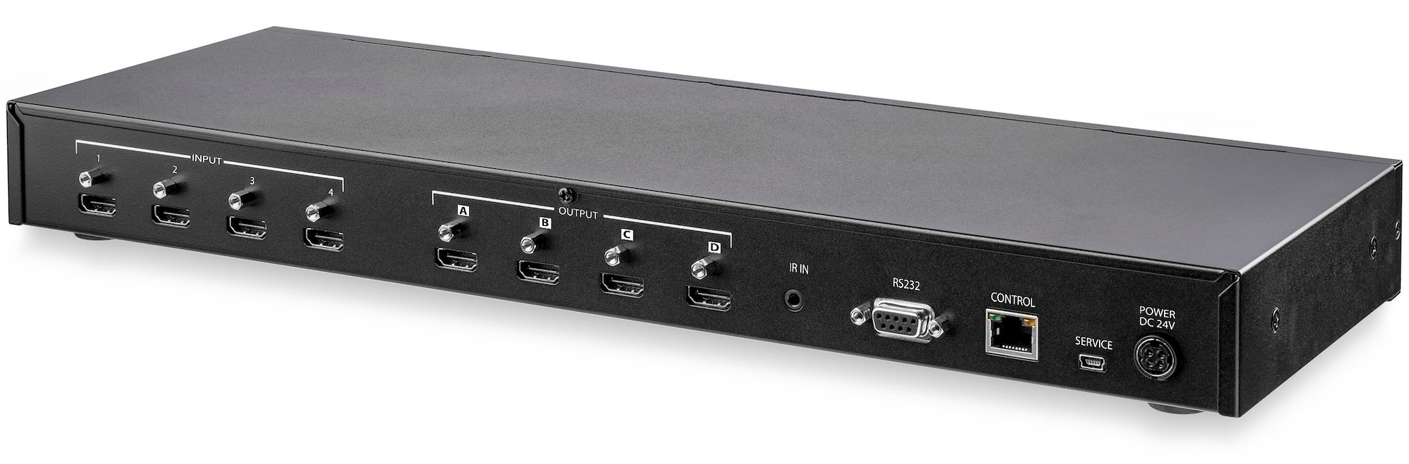 This 4x4 HDMI matrix switch lets you share four HDMI video sources between four independent displays or projectors, and switch between which source is active on each display device.