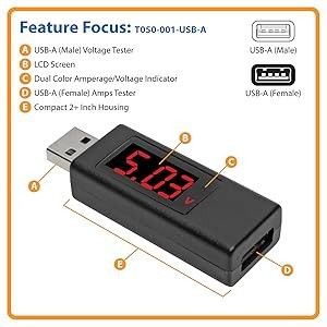 Tripp Lite’s T050-001-USB-A voltage and current tester kit connects to a USB-A female port on a power source device, such as a laptop or charging station. Its other end connects to a USB-A cable and the device you wish to charge. Its LCD screen will inform you of both the source port’s voltage capacity and the amperage that the connected device is drawing so you can reliably monitor the charging of devices. Its black, pocket-size housing and immediate diagnostic reading make it a convenient tool to bring to conferences, tradeshows, hotels and airports for testing charging capabilities of available USB-A ports.
