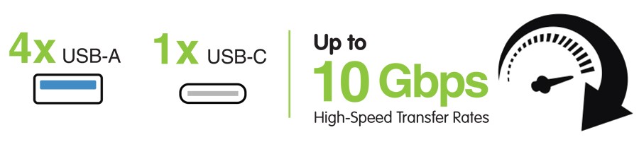 Transfer files ultra-fast between your computer or tablet and your connected devices* at speeds reaching up to 10 Gbps via the hub's USB-C and USB-A ports. With its five SuperSpeed USB 3.1 ports, the hub allows for rapid synching, saving and transfer of photos, video or documents.
