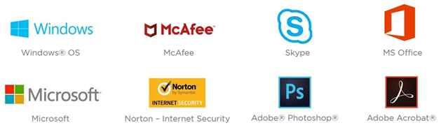 Windows® OS, Lenovo™ SHAREit, Lenovo OneKey™ Recovery, Lenovo REACHit, Lenovo Photo Master, McAfee® LiveSafe™ (30-day trial), Adobe® Photoshop® software, Adobe Acrobat® software, Cyberlink Power DVD, Chrome OS, Dropbox, Intuit Quickbooks, McAfee, MS Office, Windows, MS Works, MS Works Plus 2008, Norton AnitVirus, Norton Internet Security, Roxio Creator, Skype.