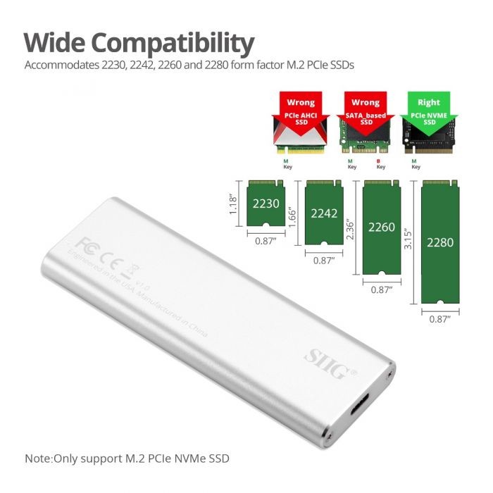 Accommodates 2230, 2242, 2260 and 2280 form factor M.2 M Key PCIe NVMe SSDs