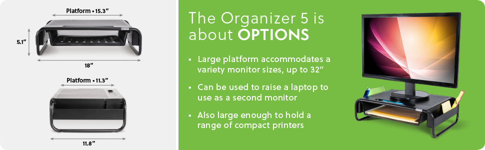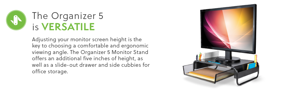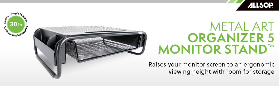 The Allsop Metal Art Organizer 5 Monitor Stand is a multi-function monitor stand that organizes your workspace while raising your monitor to a comfortable ergonomic viewing height. Featuring five organizing features, this all-steel monitor stand is the perfect way to clear clutter and free up valuable desk space.