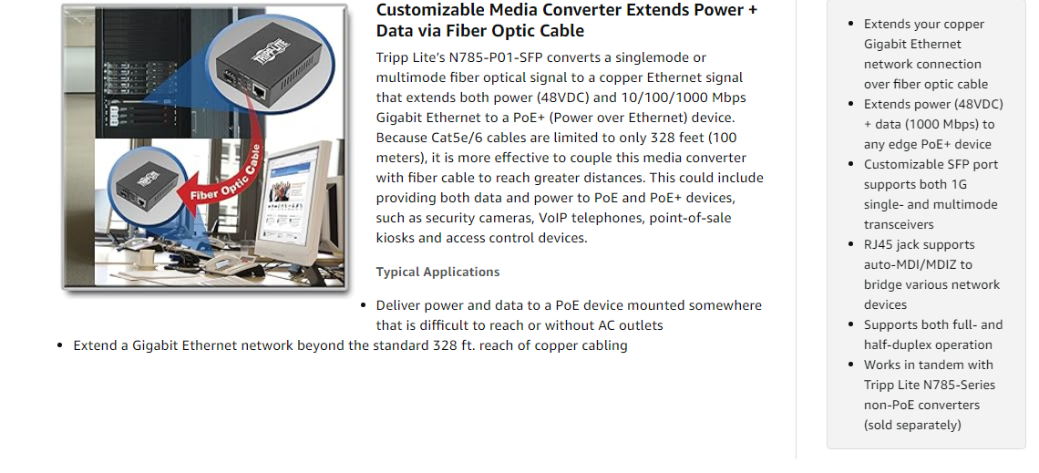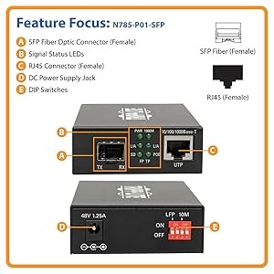 The N785-P01-SFP lets you choose a transceiver that suits your system, while also delivering power to your PoE+ device (Tripp Lite's N286-01GSX-MDLC and N286-01GLX-SLX transceivers sold separately). It connects to a Tripp Lite N785-Series non-PoE media converter using your choice of singlemode or multimode cabling. It also delivers data and power to a 10/100/1000 Mbps PoE device up to 328 feet (100 meters) away using Cat5e/6 cabling (such as Tripp Lite’s N001- or N201-Series cables).