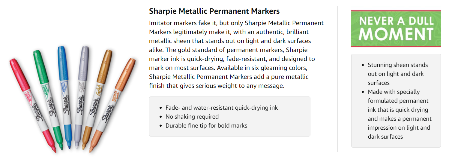 Sharpie Metallic markers deliver quick-drying, pure metallic marks that resist fading and water. What's more, you don't need to shake before you mark.