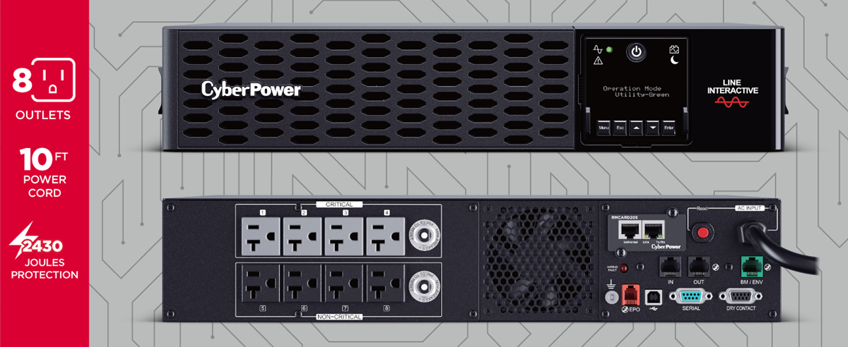 This unit is equipped with eight battery and surged protected outlets. Four outlets provide critical load protection to safeguard critical equipment.