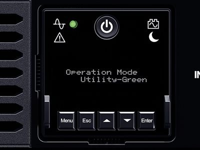 The LCD screen tilts and rotates to provide better view angles depending on how the UPS is mounted. Provides information for the UPS status, UPS setup control management, and testing options.