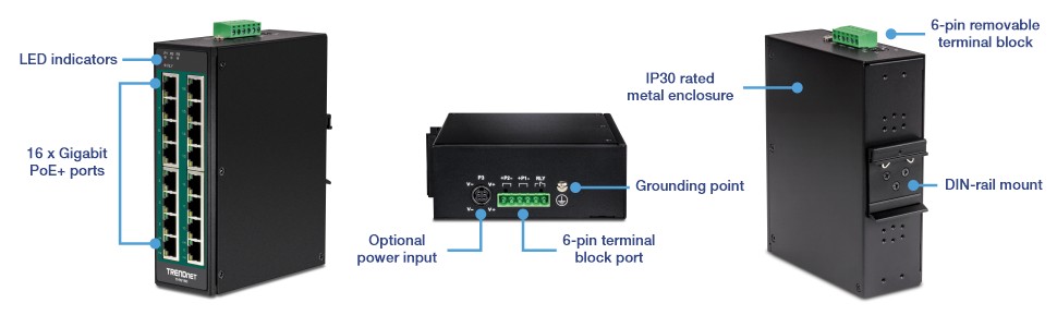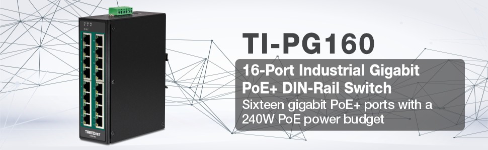 TRENDnet's 16-Port Industrial Gigabit PoE+ DIN-Rail Switch, model TI-PG160, has sixteen gigabit PoE+ ports with a 240W PoE power budget. Users are able to connect sixteen PoE+ devices to the industrial PoE switch, while still providing two gigabit ports for additional network connections. The industrial PoE switch is equipped with an IP30 rated metal enclosure, designed to withstand a high degree of vibration and shock, while operating within a wide temperature range of -40° – 75° C (-40° – 167° F) for industrial environments.