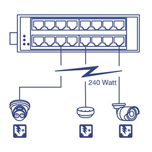 A 240W PoE+ power budget supplies up to sixteen Power over Ethernet devices with PoE+ power