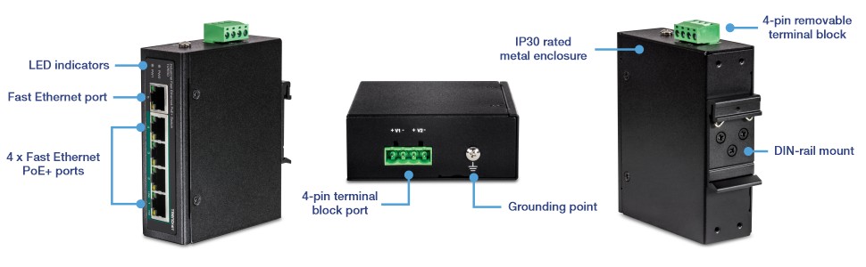 4 x Fast Ethernet PoE+ ports and 1 x Fast Ethernet port