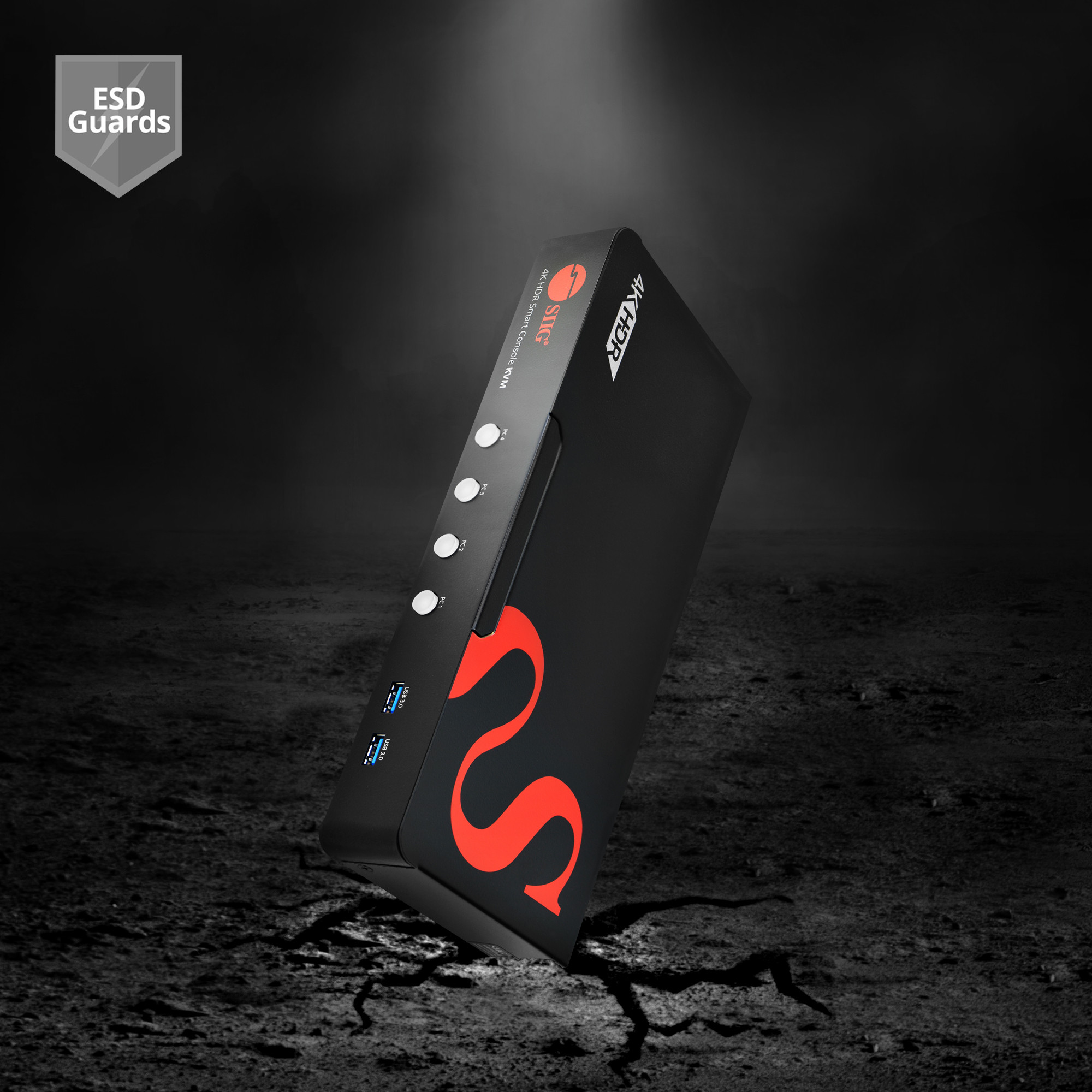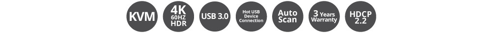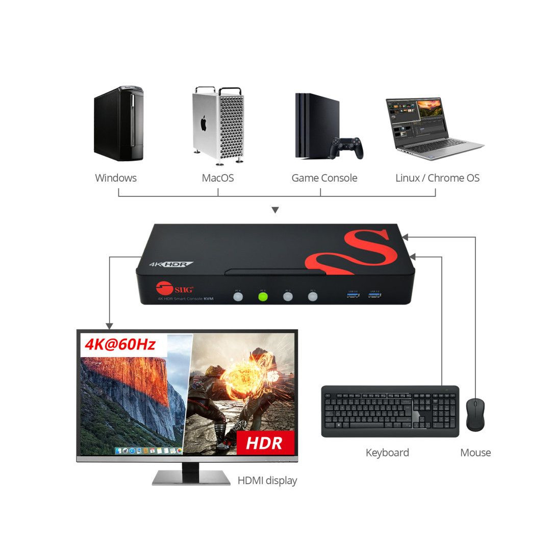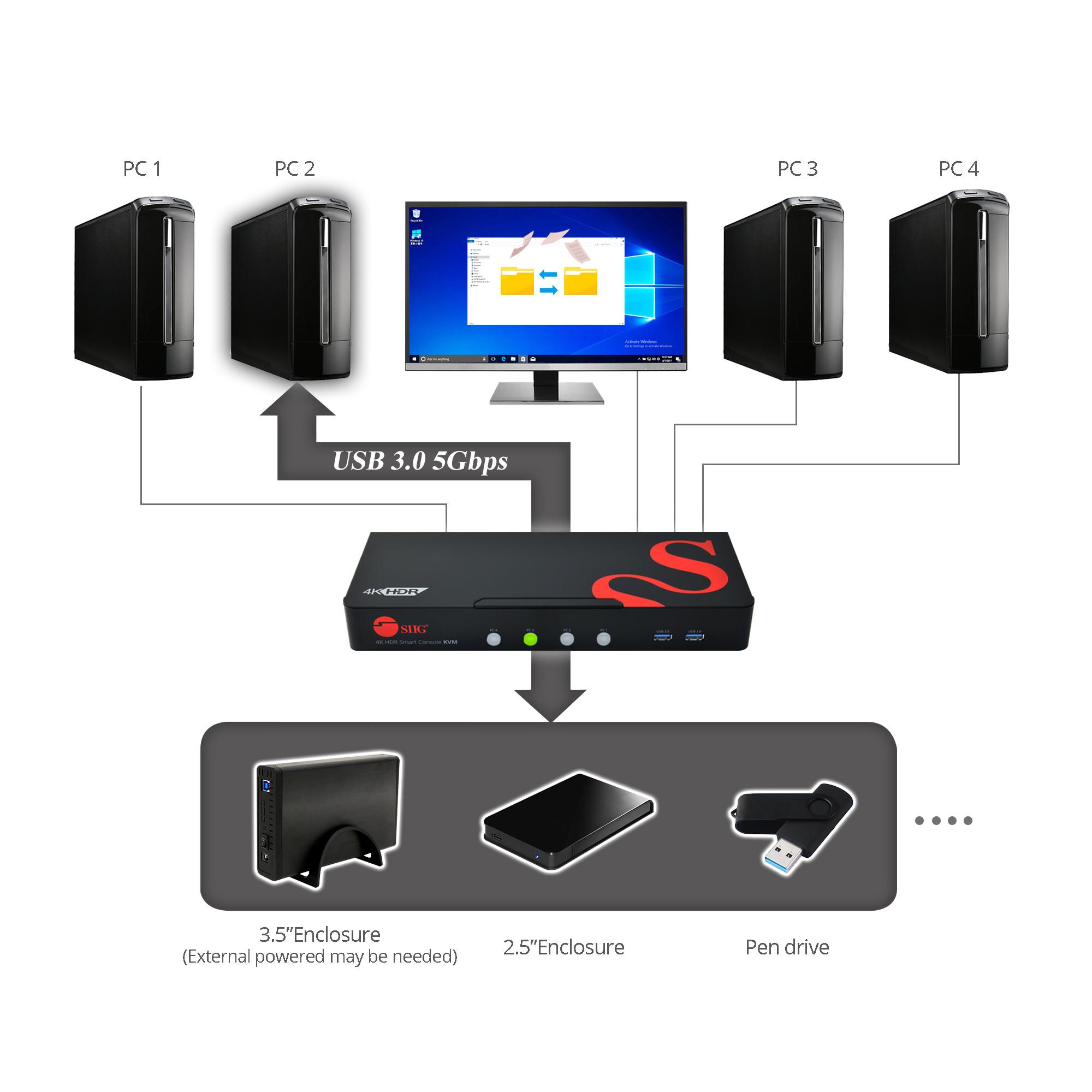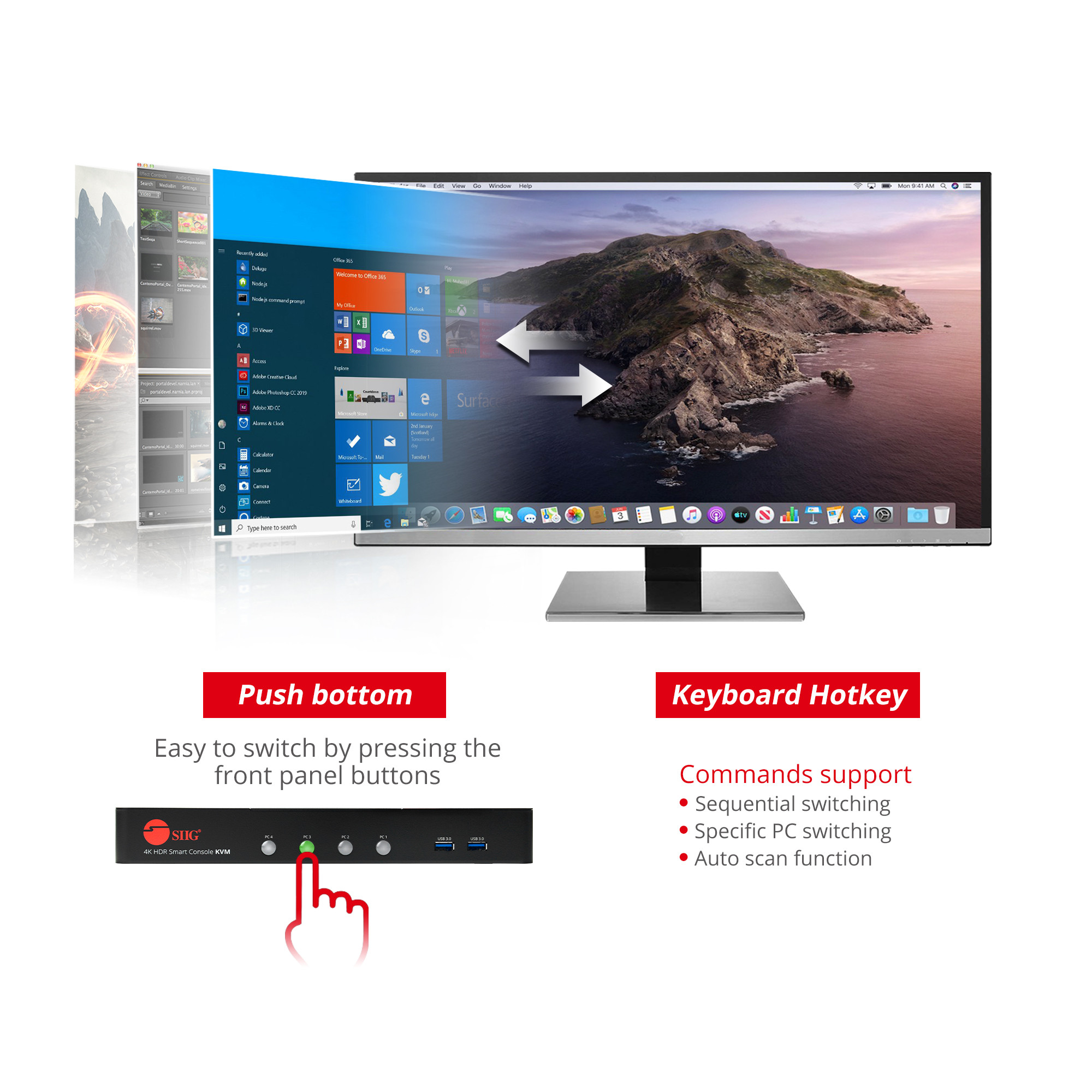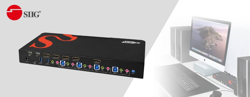 Allows you to control four computers using one keyboard and mouse, 4K resolution HDMI video signals, USB 3.0 ports, microphone input, and stereo audio output