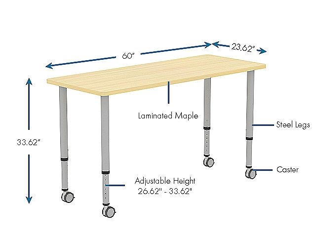 This versatile multipurpose rectangular table is the perfect companion for your training and meeting needs. The sturdy steel legs can adjust in height from 26 5/8" to 33 5/8". Safety casters on the legs provide easy mobility to relocate the table and lock the table in place. The durable laminate with edge banding offers a tough work surface.