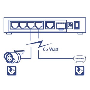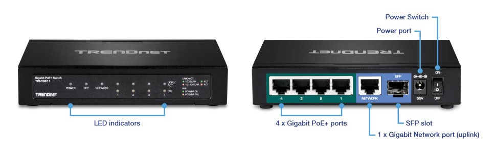 PoE+ PowerThe small network switch with SFP support features a 65W total PoE power budget that supplies up to four Power over Ethernet devices. |
