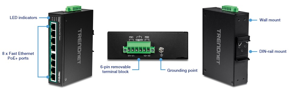 The industrial unmanaged PoE+ switches each supply up to 30W of power per port and data over a single Ethernet cable to PoE devices
