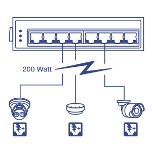 A 200W PoE+ power budget supplies up to eight Power over Ethernet devices with PoE+ power