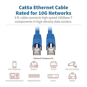 This Tripp Lite Cat6a F/UTP cable with RJ45 connectors transmits 10 Gbps data, voice and video through high-speed 10G equipment, including network switches, modems, routers, adapters, hubs and patch panels.