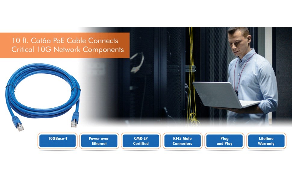 Because this Cat6a cable supports PoE, it can supply the power to operate compatible PoE devices, such as security cameras, VoIP telephones, point-of-sale kiosks and access control devices
