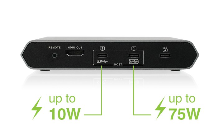 Connect your USB-C laptop to primary port #1 to get up to 75W of power and your second USB-C device to the secondary port #2 for up to 10W of power. For maximum power delivery, we recommend using a 100W USB-C power adapter. The LED on the KVM will blink, indicating that it should be connected to a USB-C power source for optimal performance.